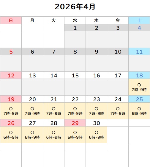 - 4月18日(土)〜28日(火):7:00〜9:00