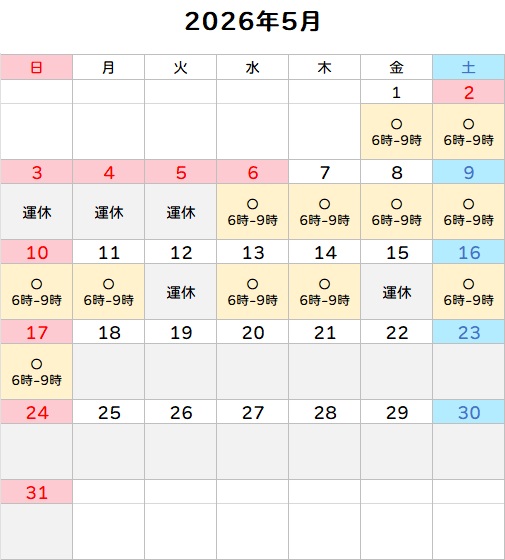 - 運休:5月3日(日)〜6日(水)、5月12日(火)、15日(金)